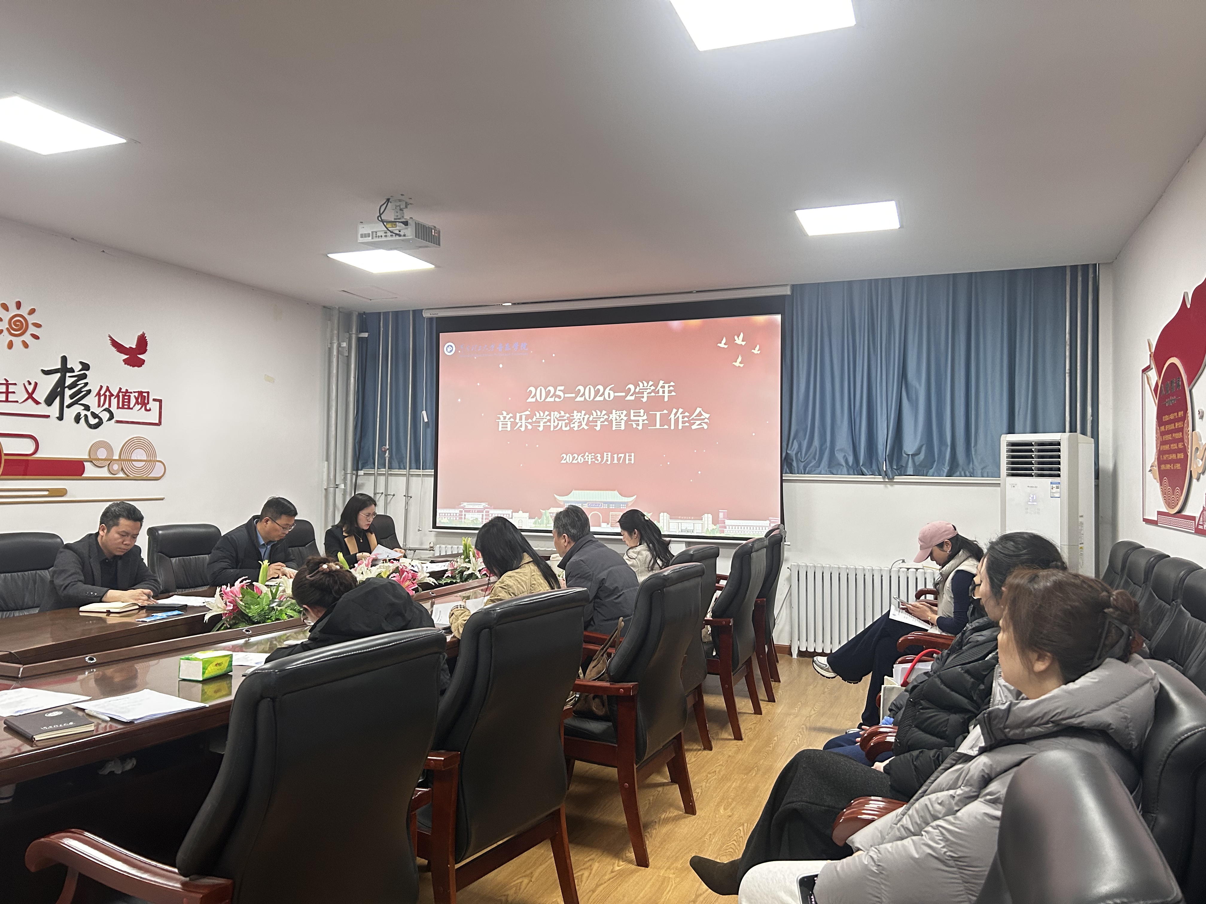 为强化课堂教学质量监控,规范教学管理,推动教学质量稳步提升,3月 17 日下午三点,音乐学院在 101 会议室召开 2025-2026 学年第二学期教学督导工作会议。会议由副院长王庆花主持,学院书记贾宝先、副书记王建军出席,相关教学管理人员及教学督导组成员参与会议。