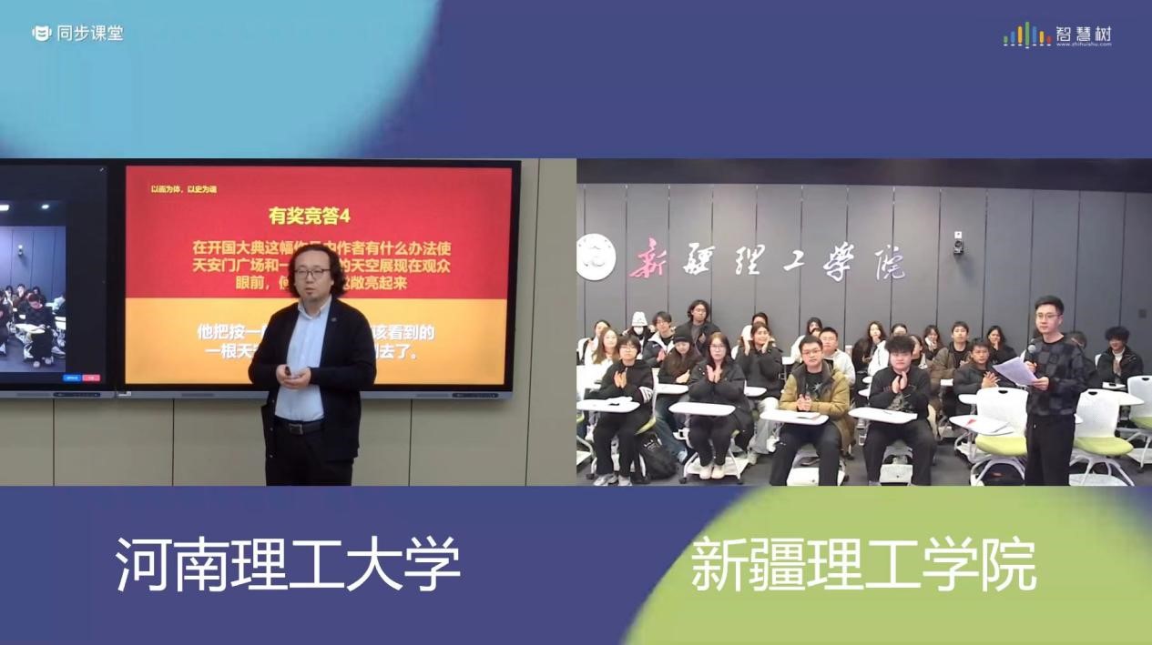 启动仪式结束后,建艺学院副院长韩宏斌利用智慧树同步课堂平台,为两校学生开启《美术鉴赏》课程线上线下混合授课。他以党史为脉络,让学生在欣赏作品的同时能够感受到画作背后的革命价值意义,从画面内容,细节处理等方面全方位深入浅出地评析画作,并以有奖竞猜的方式激发学生热情,积极开展教学互动,反响热烈。两校近百名学生相聚云端,跨越区域和时空,实现了一次别开生面的授课,效果显著。