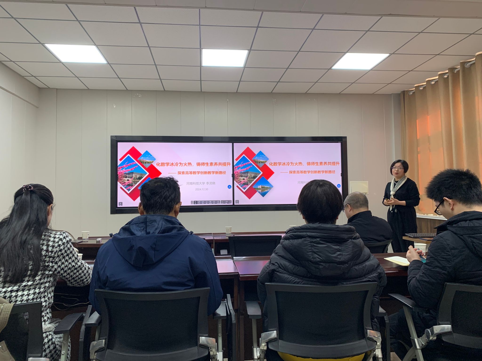 活动伊始,李灵晓作了题为《化数学冰冷为火热,育师生素养共提升——探索高等数学创新教学新路径》的报告,报告从课程建设框架、教育教学思考、数学课程思政、教学创新以及指间上的微思政等五个方面全面介绍了教学团队在建设《高等数学》课程中的探索与思考。黄元元作了题为《全国青教赛经验分享与反思》的报告,报告从青教赛简介、参赛的意义、备赛要点与难点、教学节段示例及体会与反思等方面,系统详尽地分享了自己的参赛历程及宝贵经验。两位老师的精彩分享,不仅为该院的课程建设提供了新思路,也为未来准备参加教学竞赛的老师提供了有力指导。