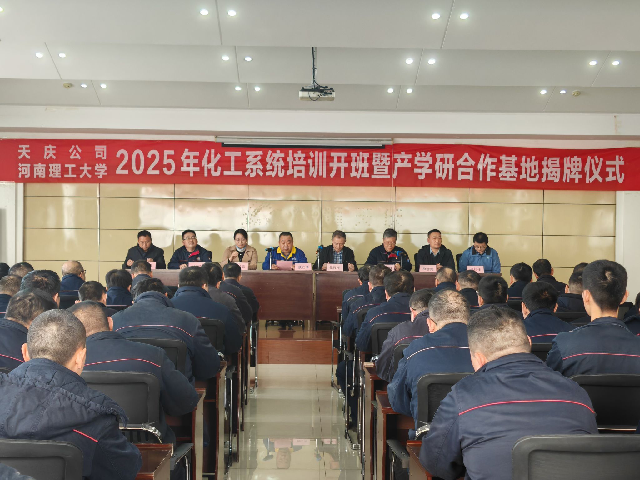 为深化产教融合、服务区域化工产业转型升级,河南理工大学以校企合作为抓手,持续提升化工人才培养质量。2025年3月9日,河南理工大学与河南晋控天庆公司产学研合作基地揭牌仪式暨化工专业知识系统培训班开班仪式在天庆公司顺利举行,通过“基地+培训”双引擎驱动,为地方企业技术革新与人才储备注入高校智慧,进一步彰显高校服务地方经济发展的使命担当。晋控天庆公司总经理魏红伟、党委副书记刘旭明,河南理工大学化学化工学院党委书记张传祥、副院长仪桂云、继续教育学院副院长张彦宾出席了活动。