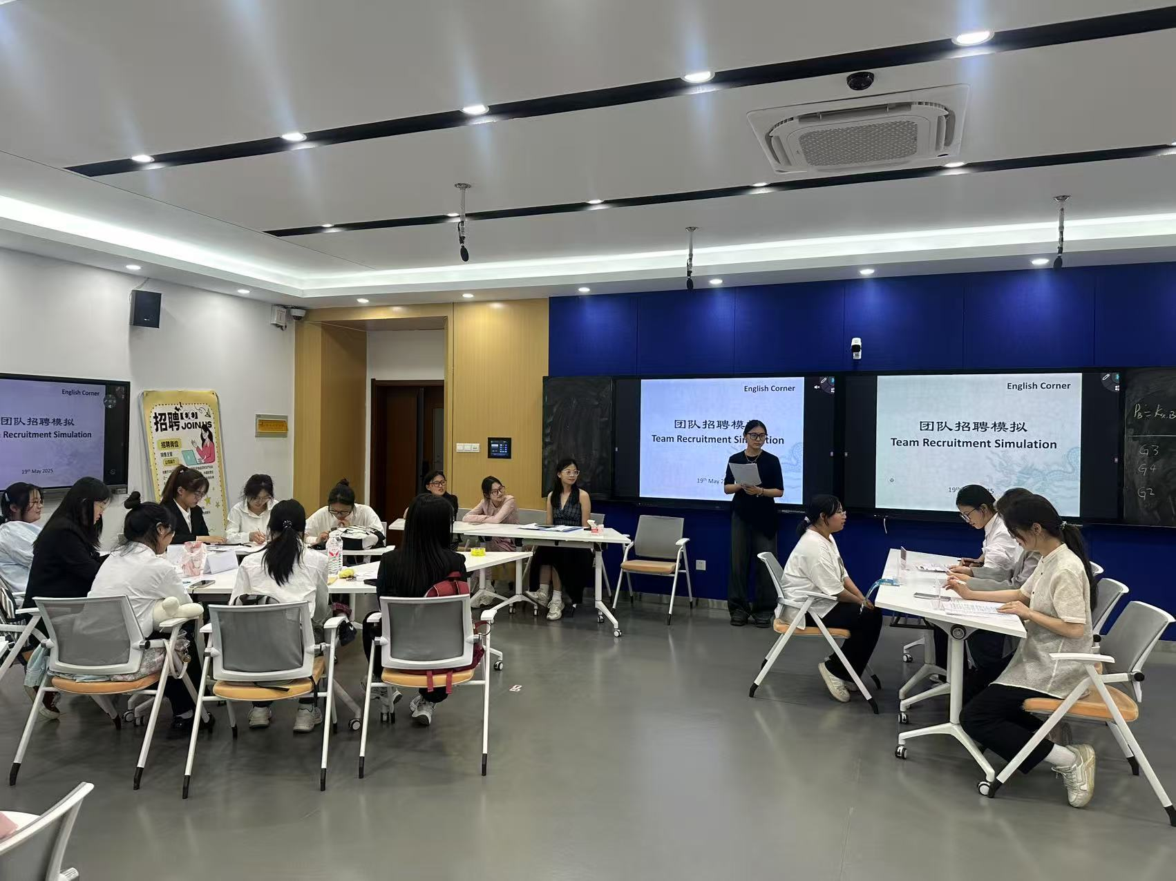 系列活动二:5月20日,以“职通未来·全球视野”为主题,开展全仿真招聘英语角赋能职场实战。活动设置“简历诊所”“模拟面试”“小组点评”三大环节。学生通过英文简历互评、跨国企业岗位面试模拟及多维度表现点评,全面锻炼中英文面试能力;在高度还原的面试场景中,学生需用英语完成自我介绍、案例分析及问题解答,并通过小组协作强化批判性思维与团队合作能力。参与学生普遍表示,活动不仅提升了英语逻辑表达能力,更让他们意识到高压面试场景中快速组织语言的重要性,为未来国际化职场奠定了扎实基础。