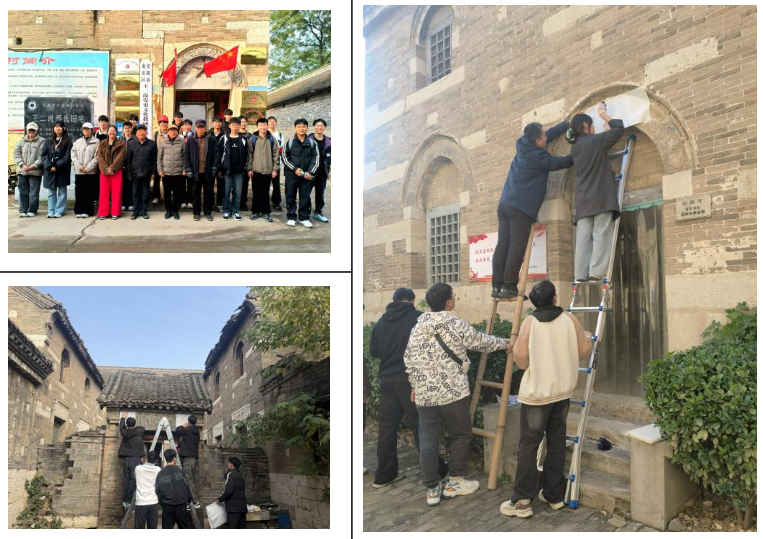 王二岗村不仅拥有丰富的古建筑遗存,更是底蕴深厚的红色教育基地,村内保留的邢氏旧宅、九门相照建筑群等清代建筑,是研究传统建筑工艺的宝贵样本,测绘工作开展前,师生们走进王二岗村红色文化教研基地,在负责人“三老”同志的带领下学习当地革命历史,聆听红色故事,从基层群众的奋斗历程中汲取精神力量。这种“专业实践+红色教育”的模式,让同学们在锤炼本领的同时,进一步坚定了理想信念,明白了青年一代的责任与担当。在古建筑测绘现场,建筑学专业师生对省级文物保护单位的清代建筑展开系统性勘察,同学们以小组为单位,分工协作完成建筑登记、面积丈量、材料记录等工作,尤其对建筑上的雕刻图案进行细致描摹,深入探究其工艺技法与文化内涵。师生们展现出理工学子严谨务实的专业素养,用实际行动诠释着“明德任责”的校训精神。